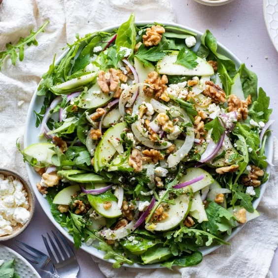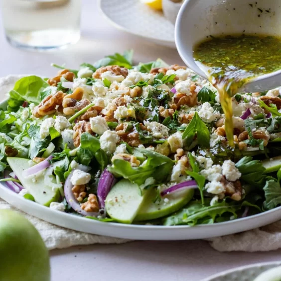 Cada ingrediente aporta frescura, textura y equilibrio: la dulzura sutil de la manzana, el crocante de las nueces, el toque ácido del limón y la cremosidad del feta 😍
