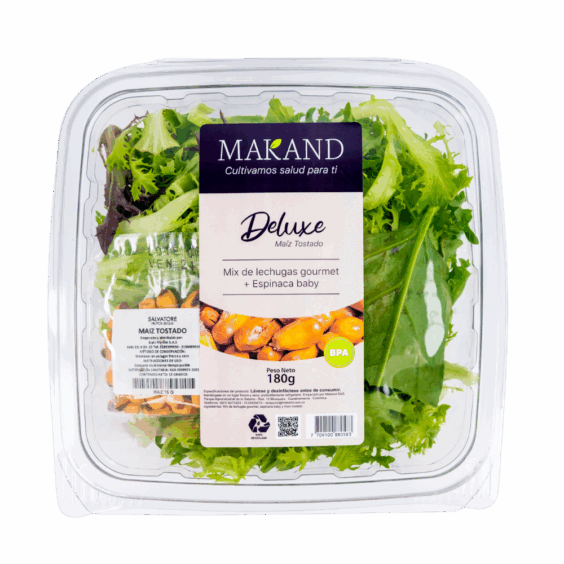 La Ensalada Deluxe Makand – Maíz Tostado combina un mix selecto de lechugas gourmet y espinaca baby, acompañado de maíz tostado natural, que aporta una textura crocante y un sabor único.